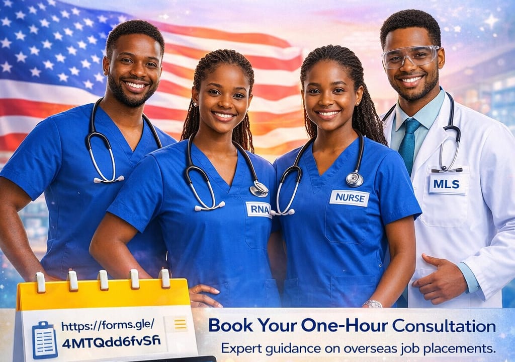 Are you a Registered Nurse (RN), Enrolled Nurse, or Medical Laboratory Scientist (MLS) seeking job opportunities in the USA? We offer a one-hour consultation to provide expert guidance on overseas job placements, including application processes, requirements, and strategies to secure employment successfully.